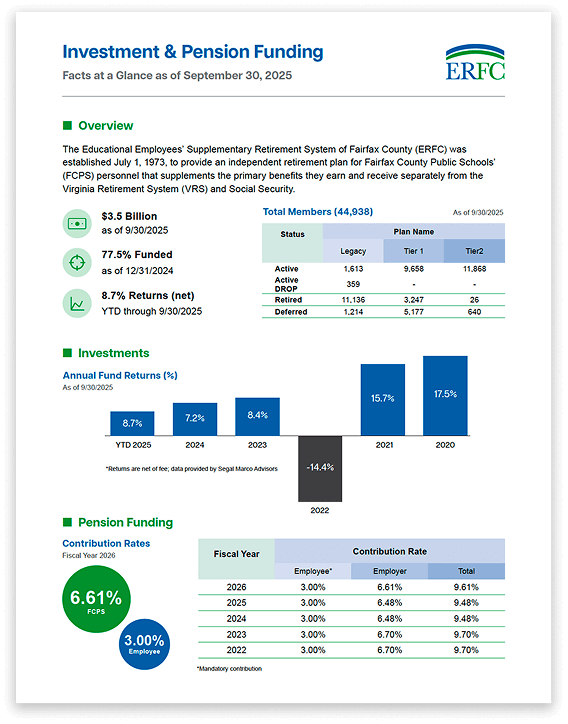 ERFC manages a $3.5 billion supplemental pension plan for FCPS employees, utilizing long-term investment strategies and highly diversified portfolios in coordination with investment consultants to maximize stability and minimize risk.